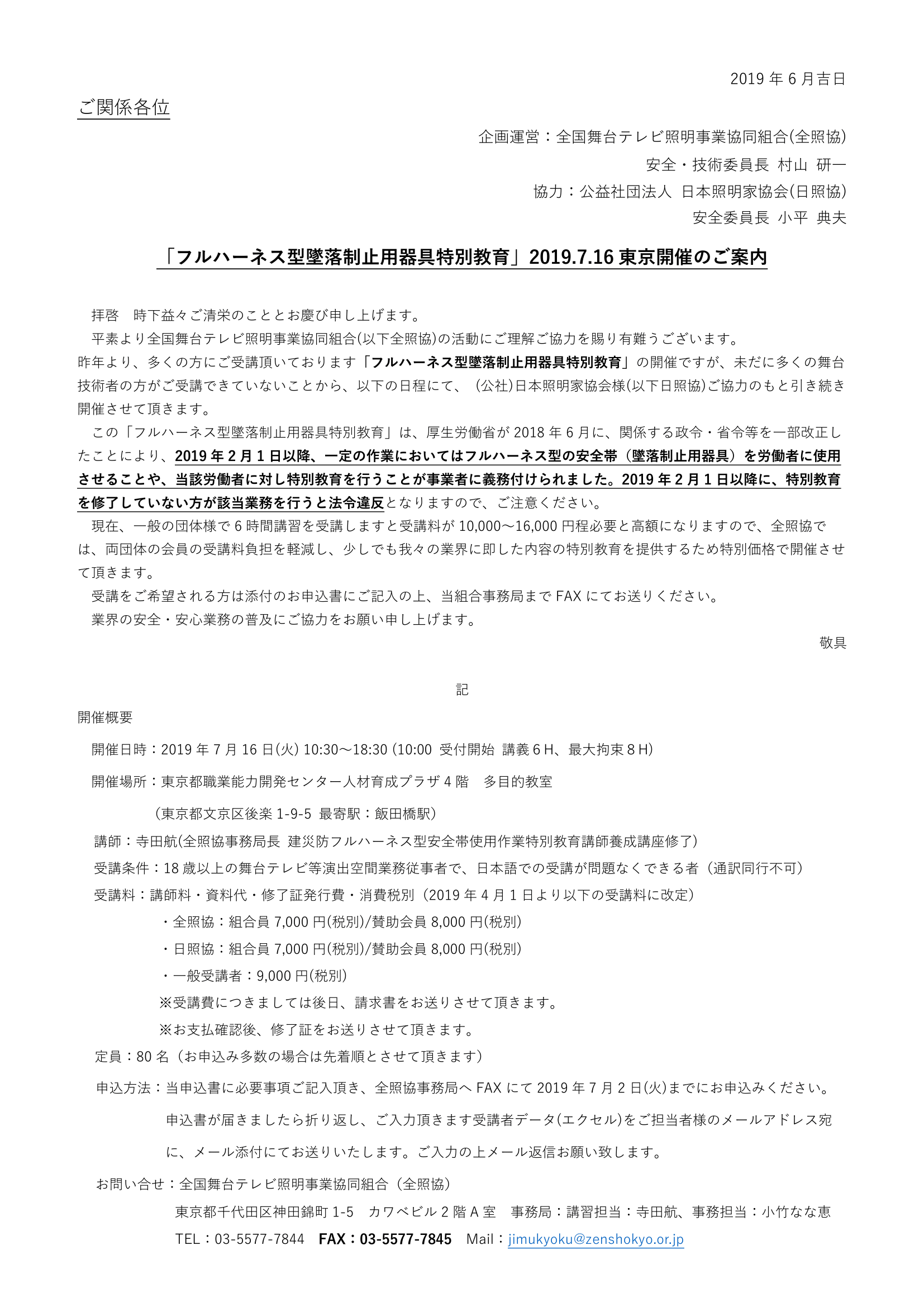 詳しくは下記PDFをご確認のうえ、2019年7月18日(木)11時までに全照協事務局までお申込みください。